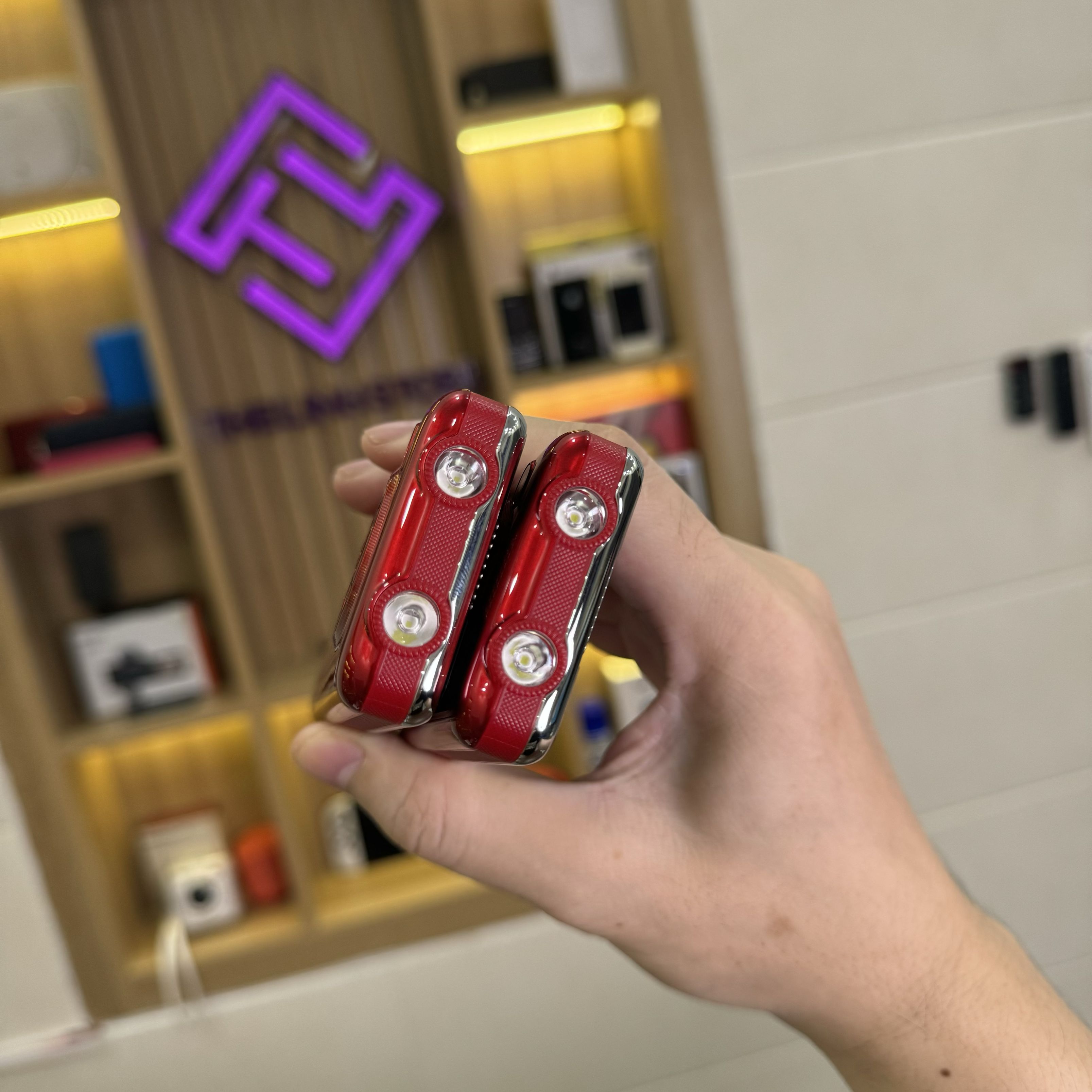 + Có đèn pin kép rất sáng, có nút gạt bên hông máy tiện dụng để bật tắt đèn pin